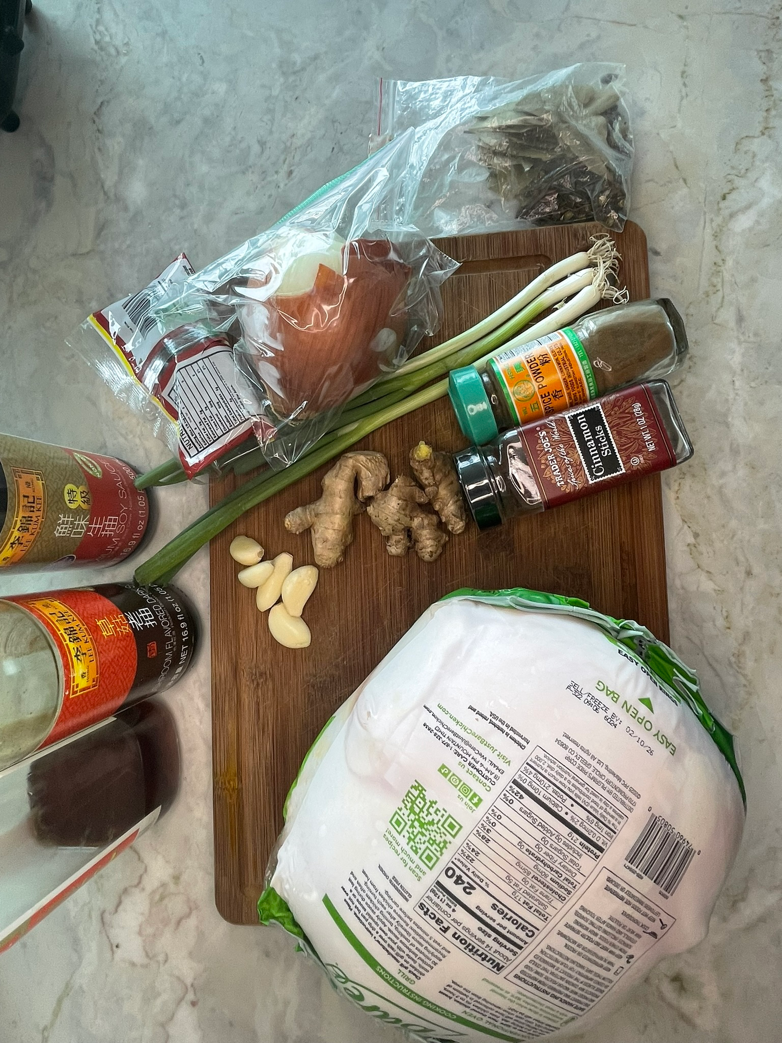 Thoroughly pat the chicken dry inside and out with paper towels. This is crucial for even coloring. Rub the exterior with 2 tbsp of Shaoxing wine. Stuff the cavity with half of the green onions (cut into 3-inch pieces) and half of the sliced ginger.