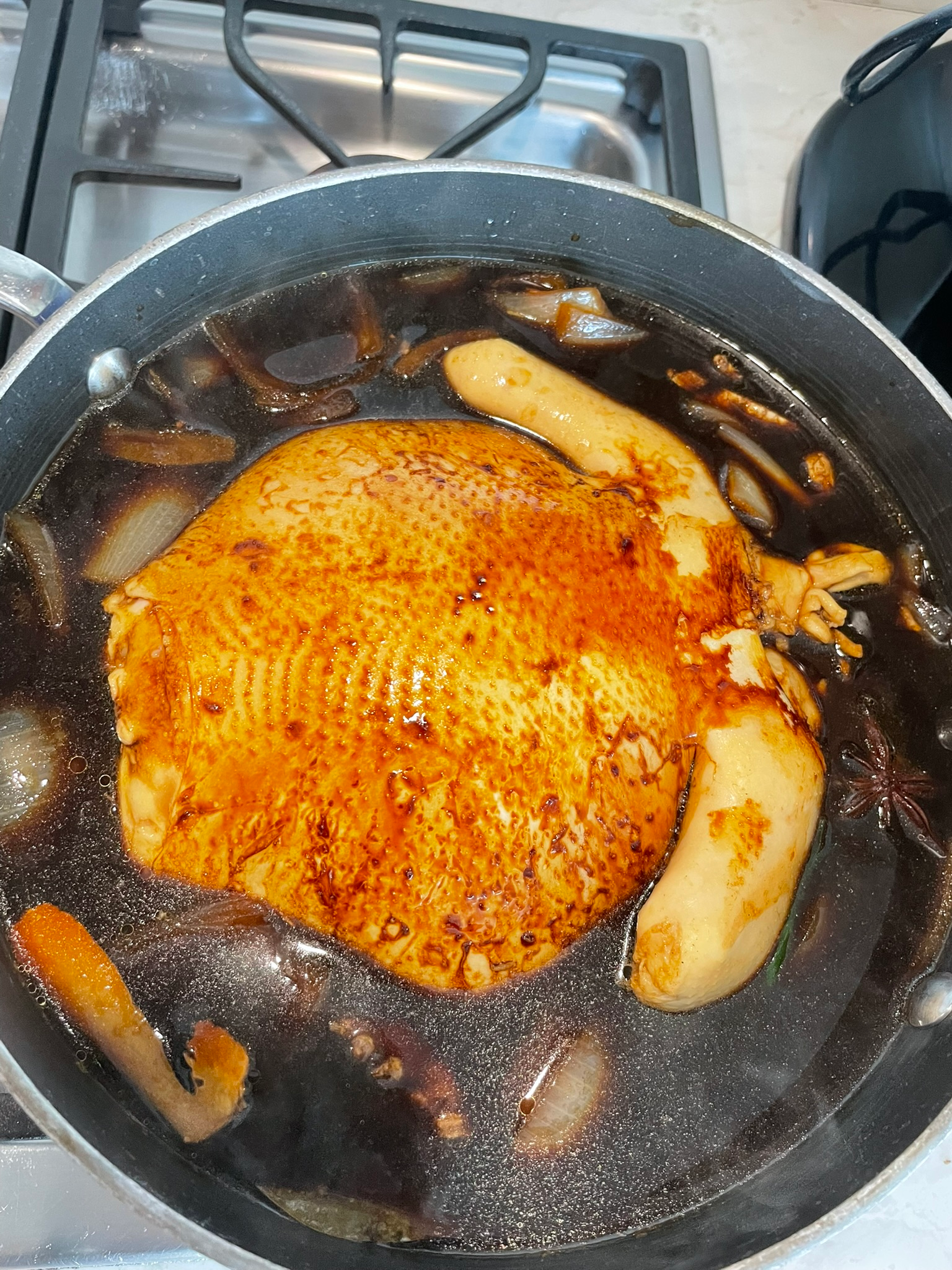 First Lowering: Carefully lower the chicken into the simmering sauce, breast-side up. Lift it out immediately and let the liquid drain from the cavity. This equalizes temperature.