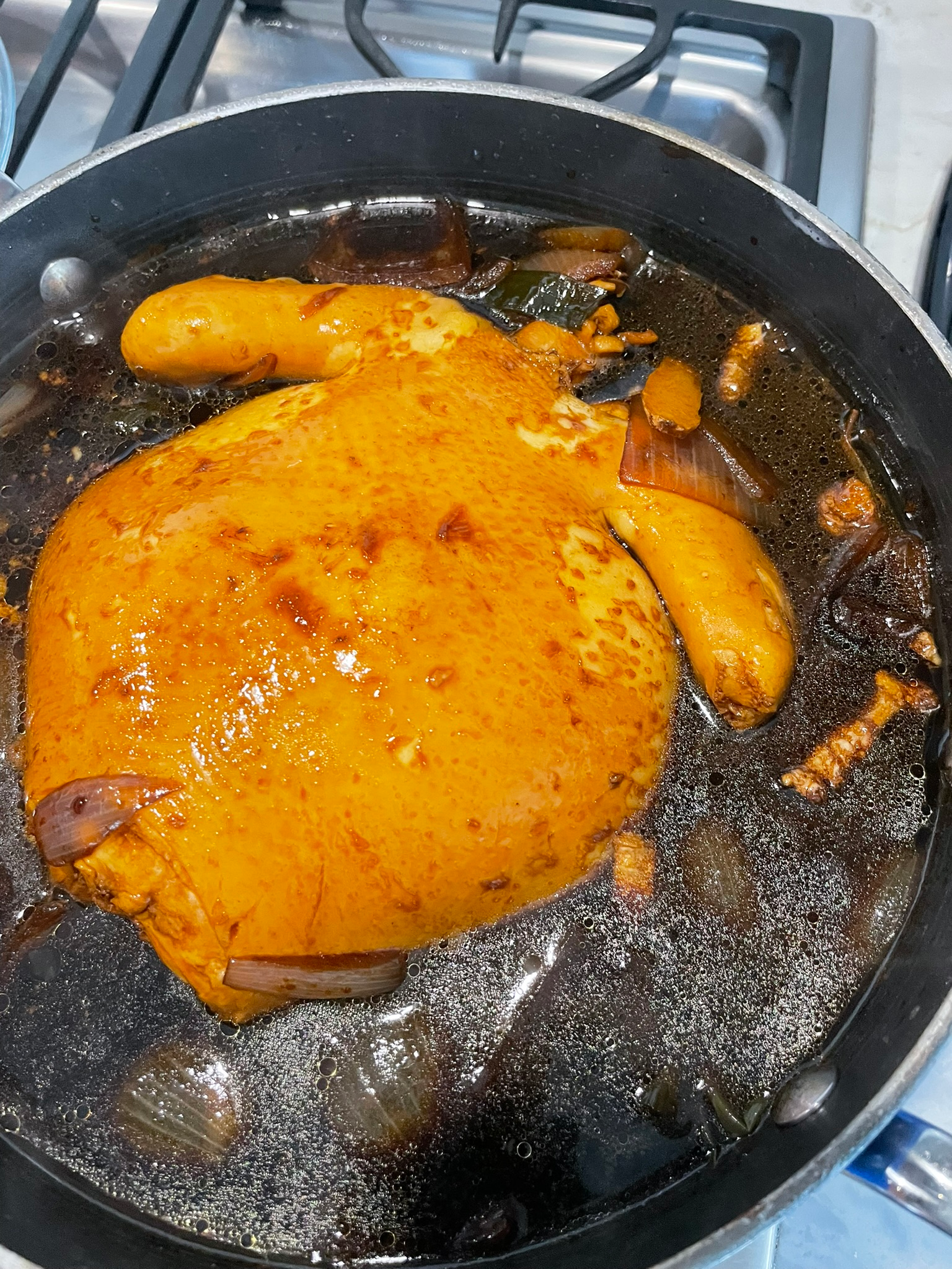 Flip & Finish: Carefully flip the chicken breast-side down. Continue simmering and basting for another 15 minutes.